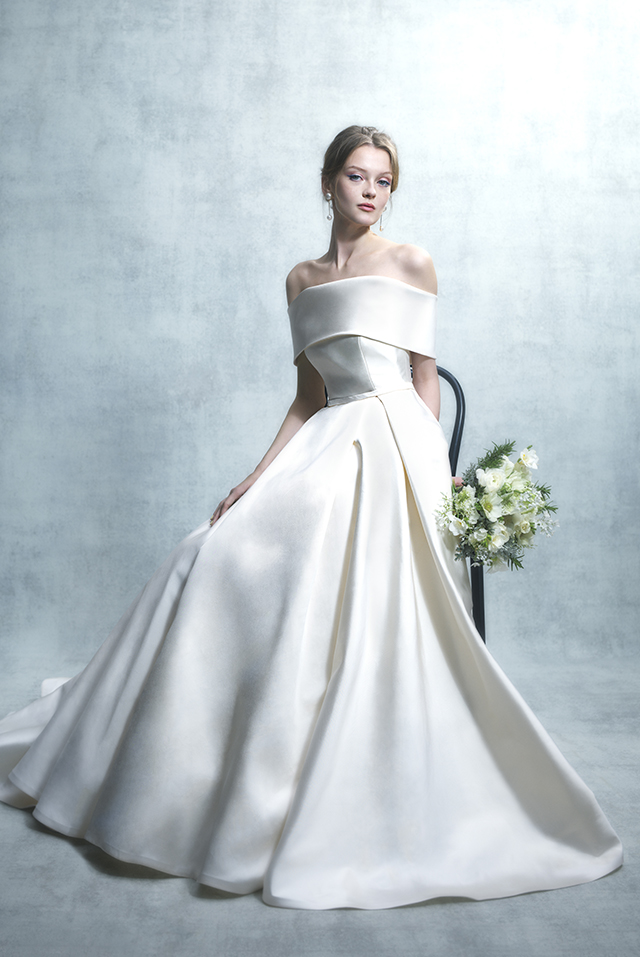 上質なミカドシルクを贅沢に使用し、特別な日にふさわしい気品漂う一着に。取り外し可能なオフショルダーデザインは、デコルテを美しく際立たせながら首元をすっきりと見せ、背中にVラインを描くことで抜け感のある優美なバックスタイルを演出します。