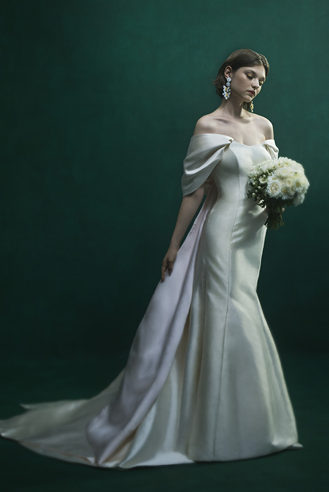 体のラインを美しく描き出すミカドシルクの光沢感、リボンモチーフを思わせるショルダーデザインでクラシカルな要素にモダンな感性を融合させた一着。オフショルダーの裏地には頬をうっすらと染めたような優しいブラッシュピンクを裏地に忍ばせることで、肌映りを一層美しく引き立てます。肌がふわっと上気したように血色感をまとい、まるで幸せのオーラを纏ったかのような印象に。さらにピンクの裏地があることで、外側の白はより際立ち、ドレス全体に立体感と存在感をもたらします。