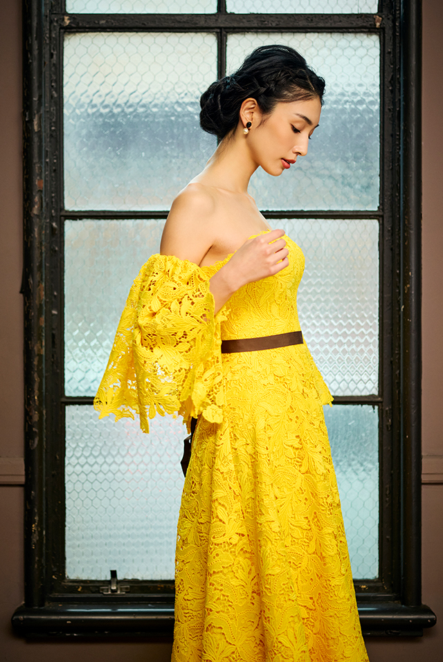 フランス製の上質なレースを鮮やかなイエローに染め上げたAラインのドレス。光を受けて美しく浮かび上がる柄の立体感が、ドレス全体に豊かな表情をもたらします。ネックラインとスリーブの縁に施したスカラップが柔らかなカーブを描き、女性らしさを演出。スリーブはあえて裏地を張らないことで素肌が透け、軽やかさを感じさせます。アクセサリーやブーケとの色合わせも楽しめ、ウエストにネイビーのリボンをアクセントにしたコーディネートもおすすめです。