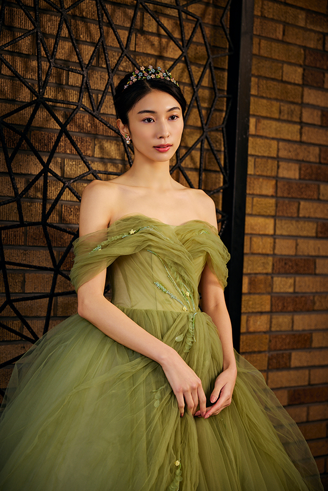 幾重にも重ねたチュールが、歩みとともにふわりと舞い上がり、花嫁をまるで森の精のように儚い表情をくわえてくれるくすみグリーンの一着。トップレイヤーには、繊細な陰影を生むクリンクルチュールを重ね、くしゅっとした柔らかな風合いがラフさと奥行きをプラス。胸元で優雅に重なり合うカシュクールから続くオフショルダーは、デコルテを美しく際立たせ、女性らしい曲線美を描きます。上品な気品とロマンティックなムードが溶け合い、特別な一日をより華やかに、そしてドラマティックに彩ります。