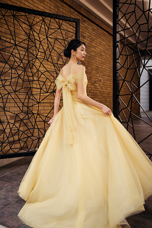 ネックラインからヒップラインにかけてリズミカルに煌めくスパンコールが、まるで光の波のように揺れるゴールドのカラードレス。裏地や重ねたチュールのバランスにまでこだわり、写真におさめた瞬間も、上品で華やかなゴールドの輝きを放ちます。付属のスカーフは、首に巻いて垂らしたり、リボン結びにしたり、さらにはオフショルダーとして使用することも可能。お好みに合わせて多彩なアレンジを楽しめるので、一着で印象の違うスタイルを演出できます。