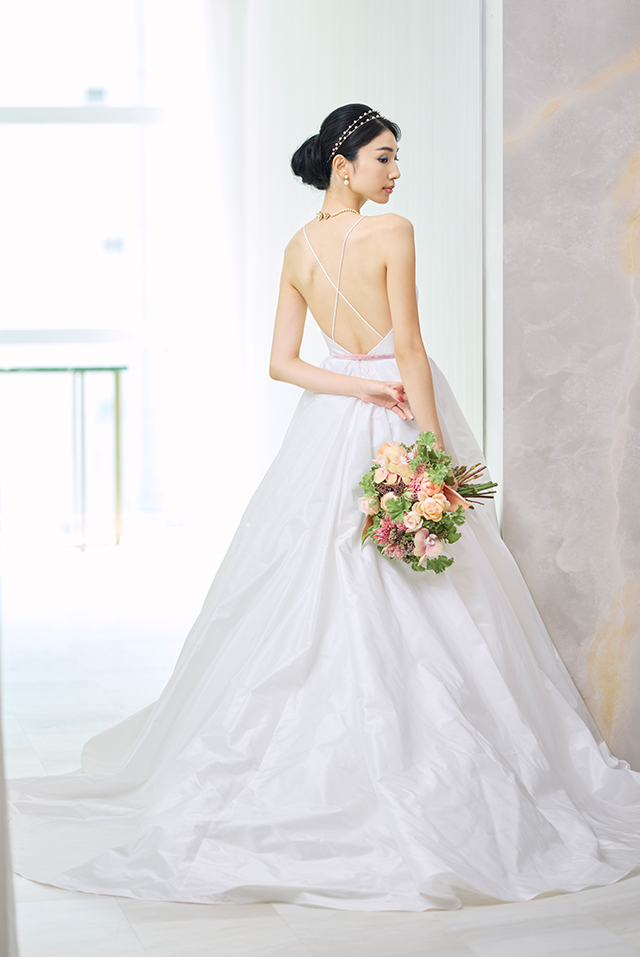 シルクタフタを存分に楽しめる一着。大きく開いた背中にはクロスしたストラップがあしらわれ、カジュアルな印象を抑えつつ、ドレスアップした特別感のあるムードを演出します。ウエストから扇状に広がるトレーンは、歩みを進めるたびに空気を含み、美しく広がるよう計算されています。