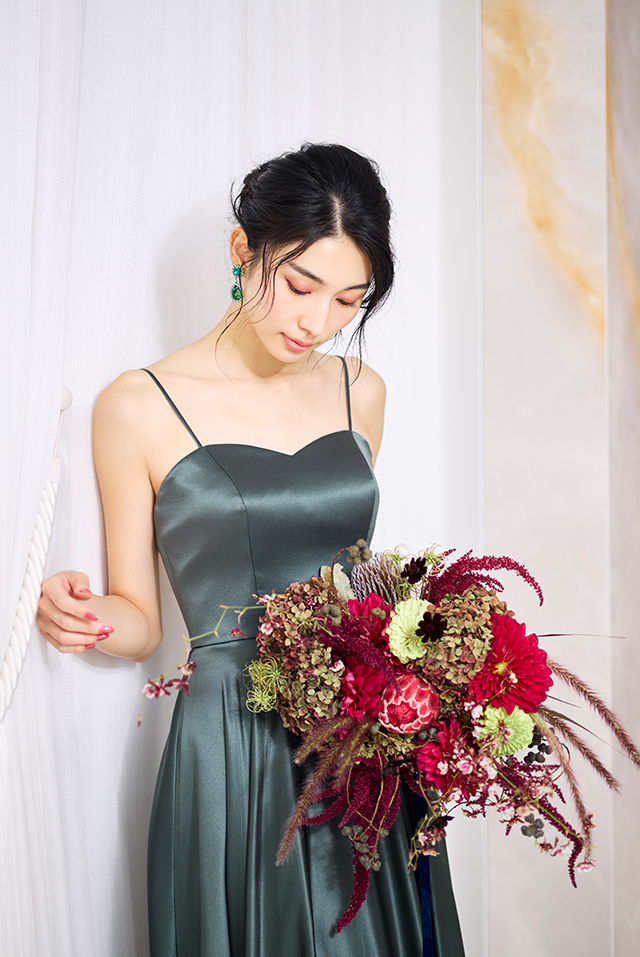 シルクサテン×フォレストグリーンというエレガントな要素に、スパゲティストラップによる抜け感、華奢さ、といった女性らしさを添えた魅力的な一着。