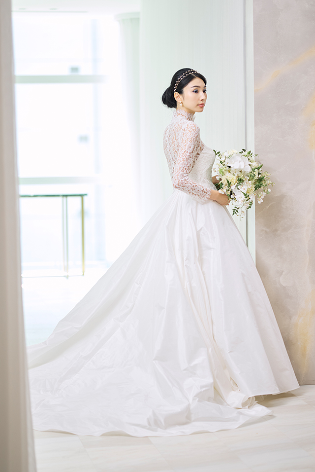 襟元・裾・袖口を美しいスカラップで仕上げた、ハイネックのレースブラウスは厳選されたフランス産の最高級レースを贅沢に使用し、軽やかな着心地でありながら程よく体に寄り添うようこだわった一枚。繊細なレースから透ける肌が女性らしい魅力を上品に引き立て、凛とした佇まいの中に柔らかな温もりを宿します。