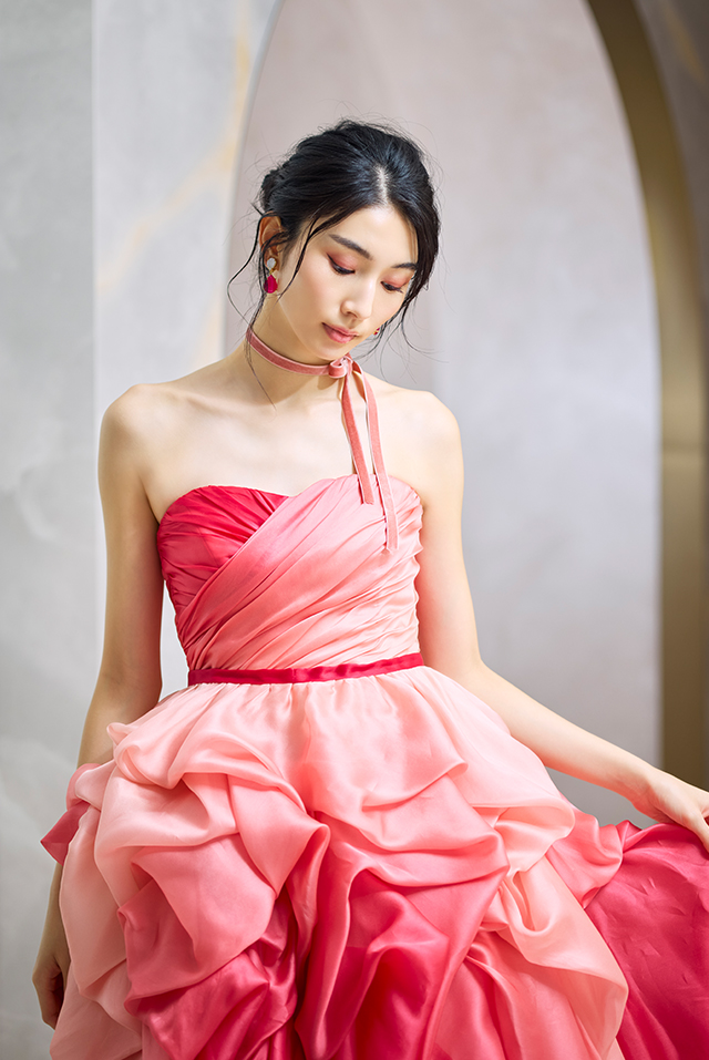 NOVARESEのシグネチャーともいえるグラデーションのカラードレス。トップスのコンパクトなシャーリングと、タッキングを施したスカートが織りなすシルエットは、可愛らしさとインパクトを兼ね備えた一着。
